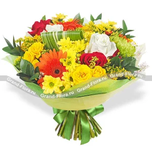 Расцветай- корзина из кустовых хризантем, роз и эустом
