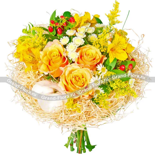 Уменьшенный: роза оранжевая - 1 шт, альстромерия - 2 шт,хризантема кустовая - 1 шт,гиперикум - 1 шт,солидаго - 1 шт,декор, декоративные яйца - 1 шт, зелень ,кокосовое волокно, сетка.