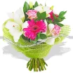 Уменьшенный: роза розовая (аква) - 3 шт., гербера малиновая - 2 шт., лилия белая - 1 шт., рускус, сетка зеленая. Примерный диаметр букета 40х40 см.