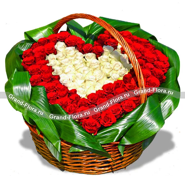 Великолепная корзина из красных и белых роз в виде сердца. Прекрасный подарок самому дорогому человеку, который расскажет все о Ваших чувствах.
