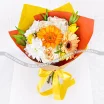 Уменьшенный: роза белая - 3 шт., гербера оранжевая - 1 шт., гербера желтая - 1 шт., тюльпан желтый - 3 шт., хризантема кустовая белая - 1 шт., декоративная зелень, упаковка, лента. Примерный размер: 20Х20 см.