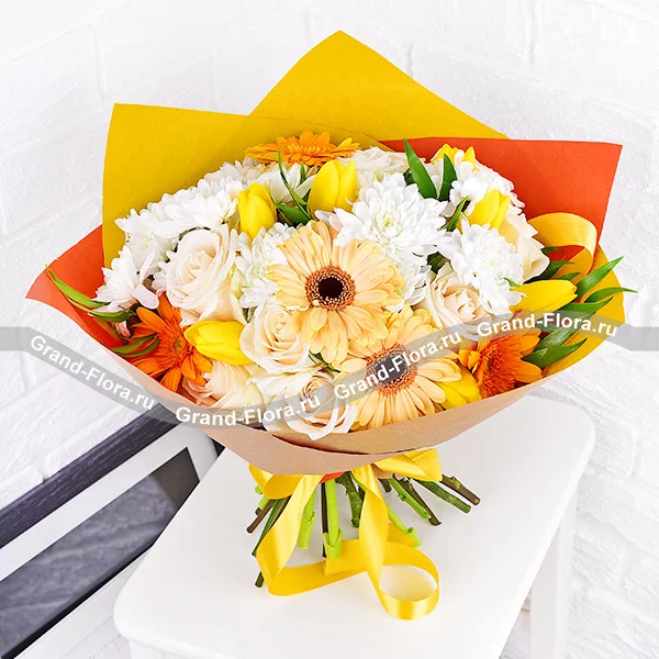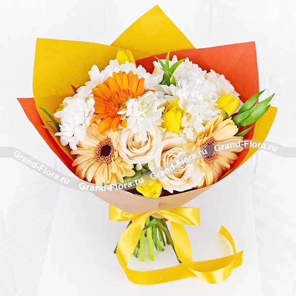 Стантартный: роза белая - 4 шт., гербера оранжевая - 1 шт., гербера желтая - 2 шт., тюльпан желтый - 5 шт., хризантема кустовая белая - 3 шт., декоративная зелень, упаковка, лента. Примерный размер: 30Х30 см.