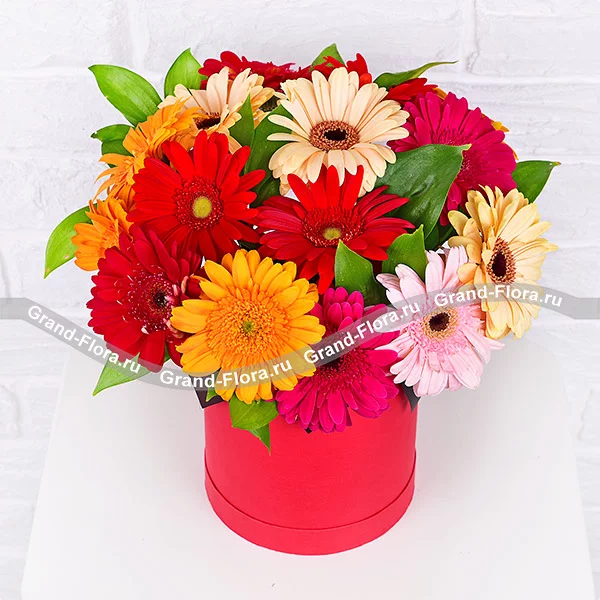 Стандартный: гербера микс - 17 шт., декоративная зелень, оазис, коробка.