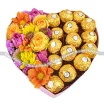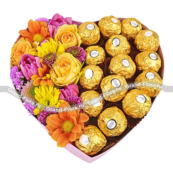 Стандартный: тюльпан фиолетовый - 3 шт., хризантема кустовая желтая - 1 шт., хризантема кустовая фиолетовая - 1 шт., хризантема кустовая оранжевая - 1 шт., статица, конфеты "Fererro Rocher" - 125гр., оазис, коробка.