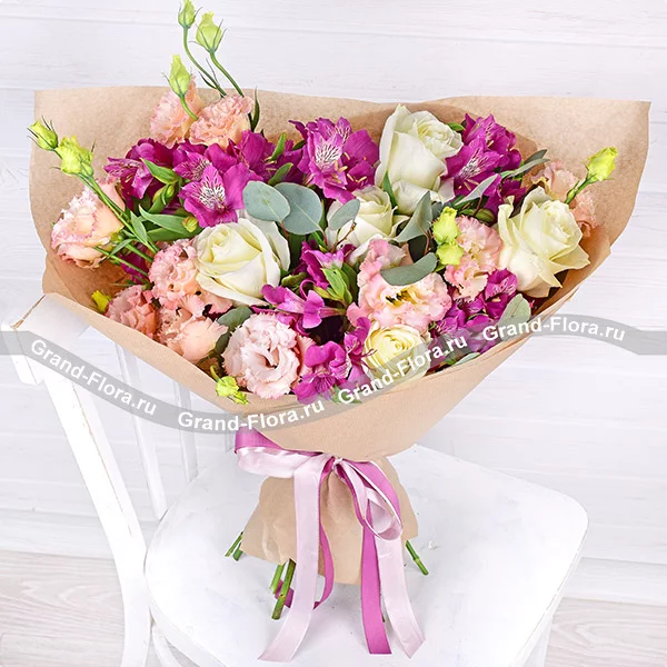 Роза белая- 5 шт., эустома розовая –  5 шт., альстромерия фиолетовая – 5 шт., декоративная зелень (эвкалипт) –  3 шт., упаковка, лента.