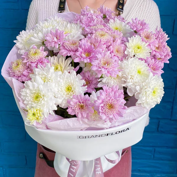 15 хризантем: хризантема кустовая белая - 7 шт., хризантема кустовая розовая  - 8 шт.,  упаковка, лента (возможна замена вида хризанетмы и оттенка розовой хризантемы от светло-розвого до темно-вишневого).